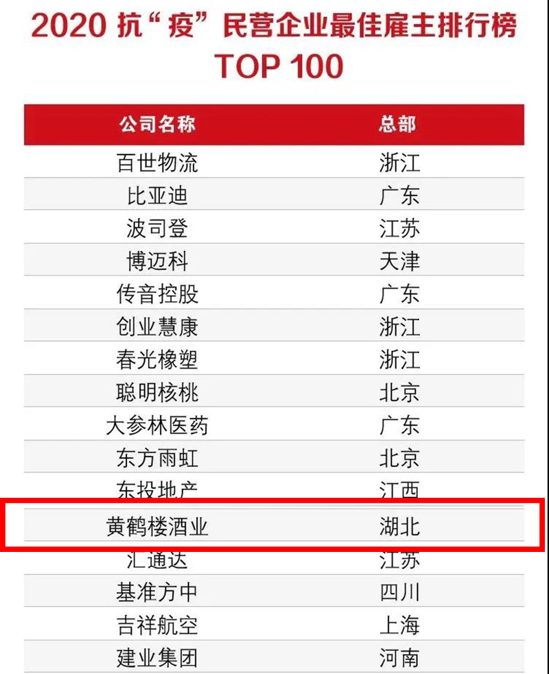 10月30日,胡潤(rùn)百富、百富天啟和前程無(wú)憂三方聯(lián)合發(fā)布2020抗“疫”民營(yíng)企業(yè)最佳雇主排行榜TOP100,黃鶴樓酒業(yè)名列其中,為湖北省唯一一家上榜企業(yè)。
