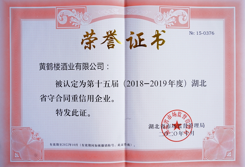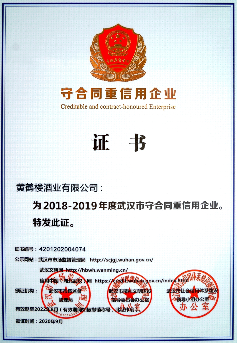 近日,黃鶴樓酒業(yè)分別獲得2018-2019年度湖北省、武漢市 “守合同重信用”企業(yè)榮譽(yù)稱號(hào)。