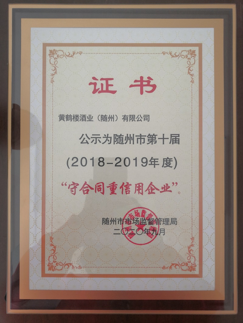 11月4日,隨州市市場監(jiān)督管理局授予黃鶴樓酒業(yè)(隨州)有限公司隨州市第十屆“守合同重信用”企業(yè)榮譽稱號并發(fā)放證書,代授湖北省第十五屆“守合同重信用”企業(yè)榮譽證書。