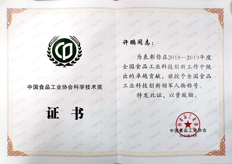 許鵬獲“全國食品工業(yè)科技創(chuàng)新領(lǐng)軍人物”稱號