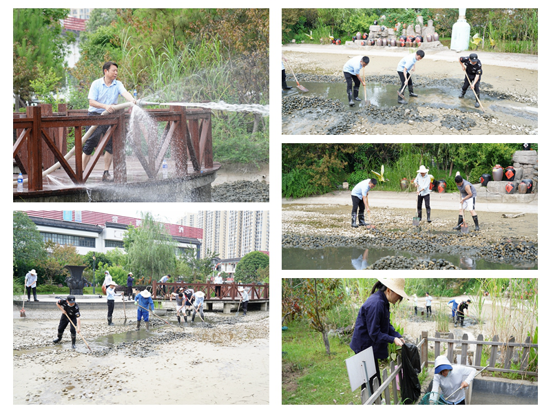 烈日下,大家換上膠鞋、手執(zhí)鐵鍬走進(jìn)小花園池塘,齊心協(xié)力、揚(yáng)鍬鏟泥。兩個(gè)小時(shí)的勞作,眾人揮汗如雨、干勁滿(mǎn)滿(mǎn),一鍬接一鍬將沉積花園池塘的淤泥徹底清理干凈。