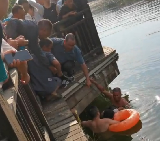 黃國(guó)勇(水下左一)吳仕田(岸邊拉繩索右一)與群眾合力救助落水者